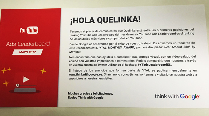 Real Madrid 360º by Movistar. Este es el título del vídeo que ha hecho que Quelinka esté dentro de los YouTube Ads Leaderboard, ranking que acredita que el vídeo en el que participó nuestra agencia esté entre los cinco más vistos y compartidos en YouTube del pasado mes de mayo. Gracias a esta campaña de marketing online protagonizada por los jugadores del Real Madrid, Quelinka ha recibido el YTAL MONTHLY AWARD, galardón que ya está en nuestras oficinas.